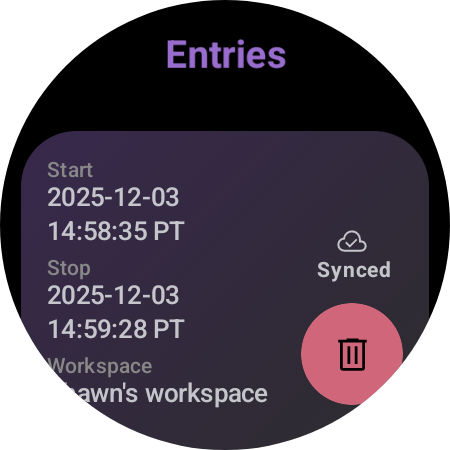 Track time offline on your watch, and the data will automatically sync to Toggl Track when connected.Registra el tiempo sin conexión en tu reloj y los datos se sincronizarán automáticamente con Toggl Track cuando estés conectado.Rastreie o tempo offline no seu relógio, e os dados serão sincronizados automaticamente com o Toggl Track quando conectado.Suivez le temps hors ligne sur votre montre, et les données se synchroniseront automatiquement avec Toggl Track lorsque vous serez connecté.時計でオフライン時間を追跡し、接続時にデータがToggl Trackに自動的に同期されます。시계에서 오프라인으로 시간을 추적하고, 연결되면 데이터가 Toggl Track으로 자동 동기화됩니다.